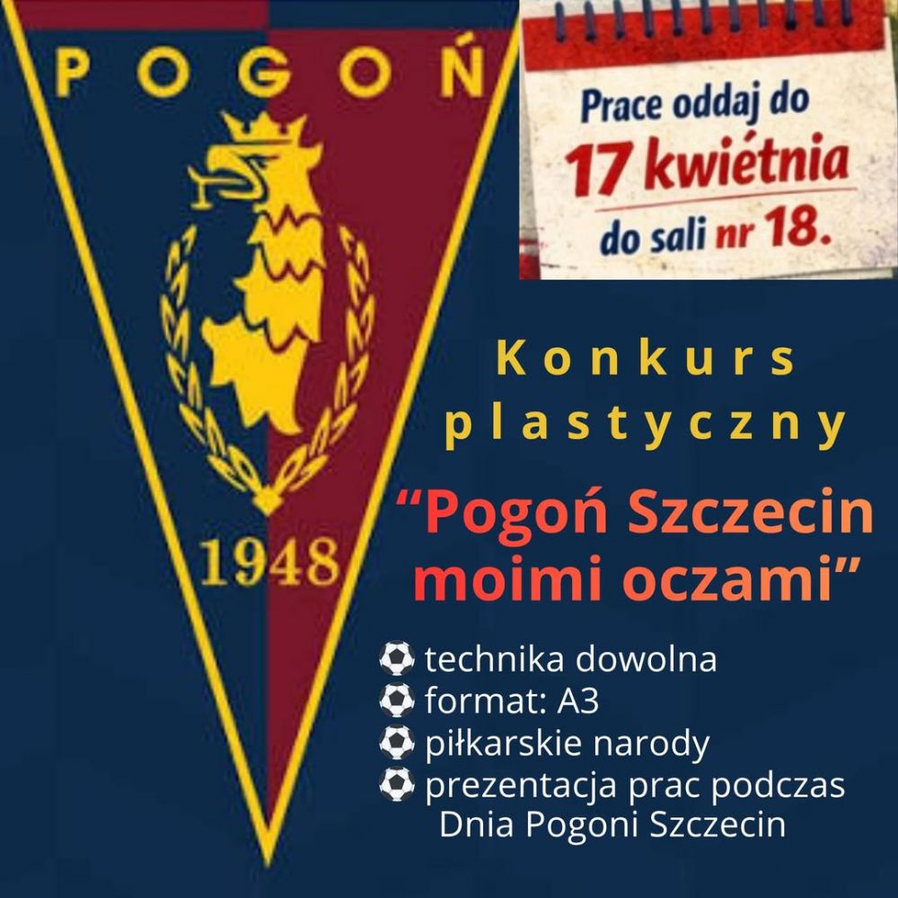 W związku ze zbliżającym się w naszej szkole Dniem Pogoni Szczecin, który odbędzie się 21 kwietnia, zapraszamy uczniów Szkoły Podstawowej nr 69 do udziału w konkursie plastycznym pt.